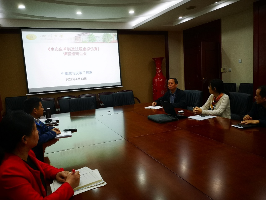 为了加快深化工程教育改革、建设“新工科”,促进“四新”建设背景下人才培养质量的提升,轻化工程教研室在院系的领导下,积极开展在教育信息化、数字化改革下的教研教改工作。2022年4月12日,《生态皮革制造过程虚拟仿真》课程组在皮革楼209会议室召开教学研讨会,学院组织员(原学院院长)何有节教授、生物质与皮革工程系系主任林炜教授(课程负责教师)、副系主任程海明教授、教研室主任但年华副教授(任课教师)和王春华副教授参加了会议。